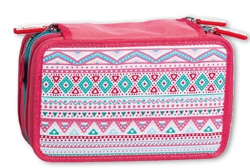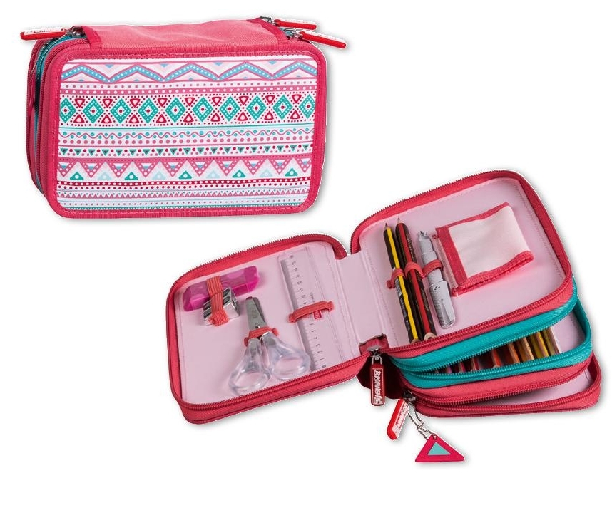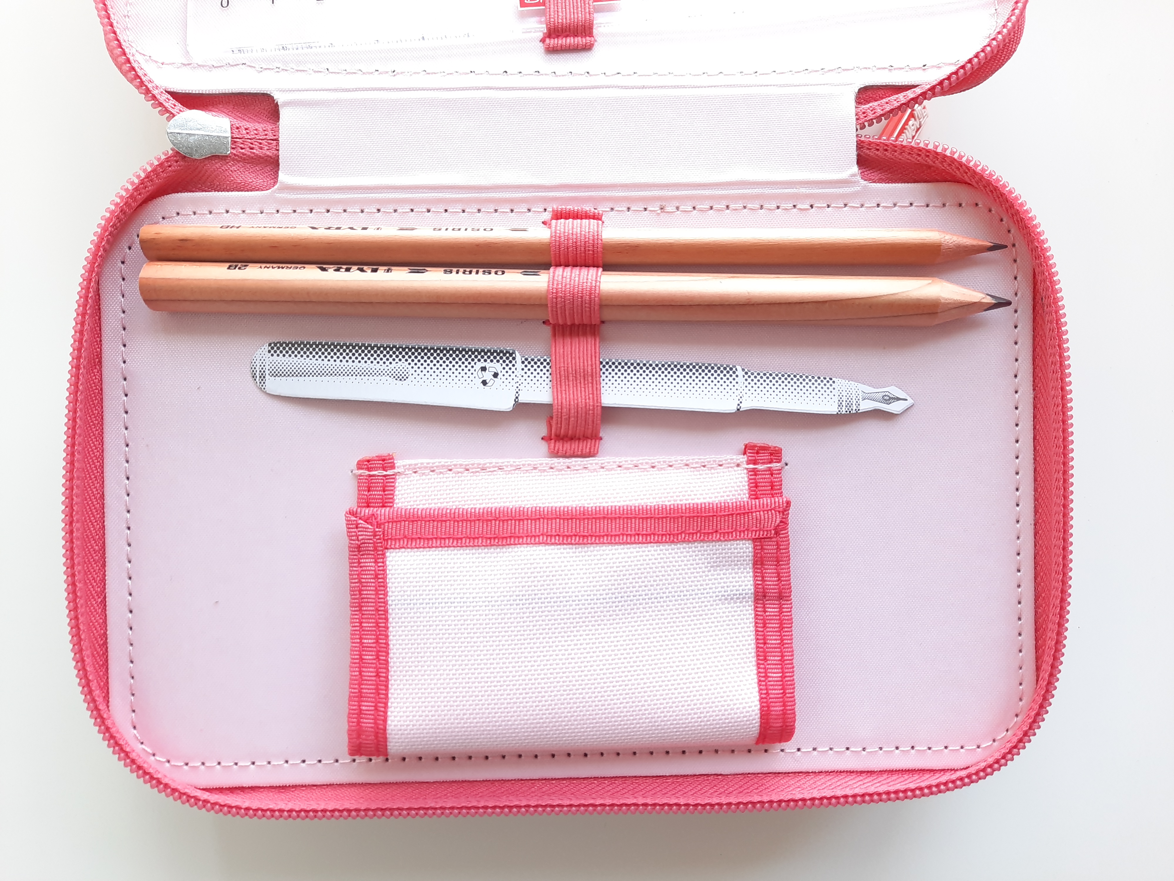 ascuţitoare metalică dublă, radieră, foarfece, compartiment pentru bani.