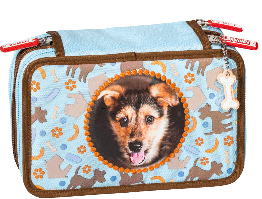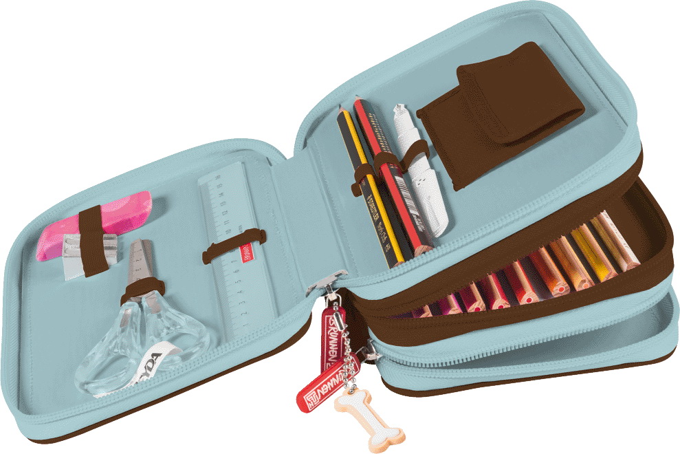 ascuţitoare metalică dublă, radieră, foarfece, compartiment pentru bani.