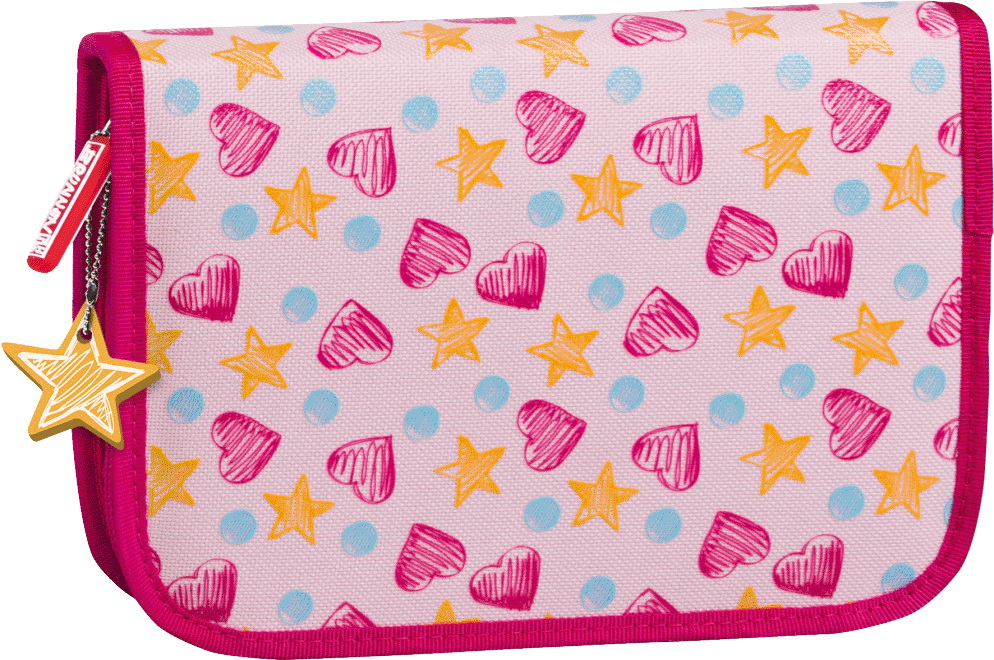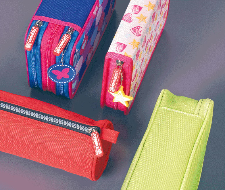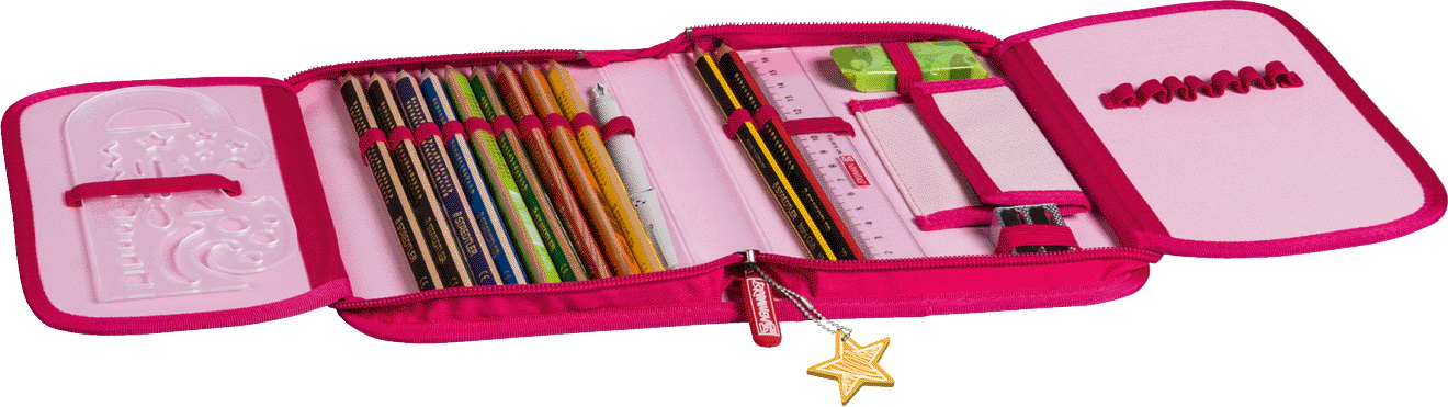 ascuţitoare metalică dublă, radieră, compartiment pentru bani, orar, șablon de desen.